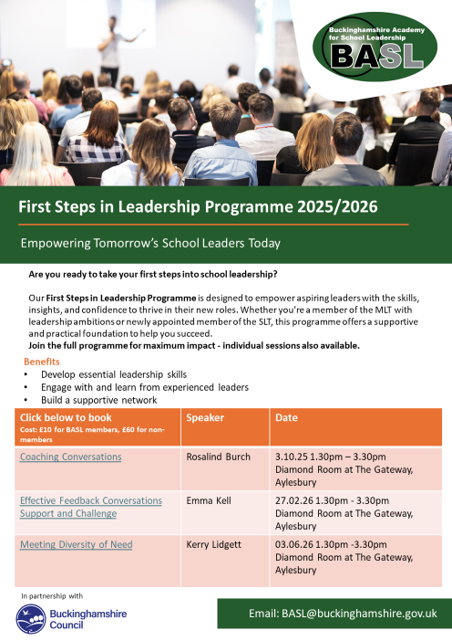This is a programme of five events completely free of charge to BASL members. It is aimed at those who are new to leadership either as MLT or SLT. See below for details.